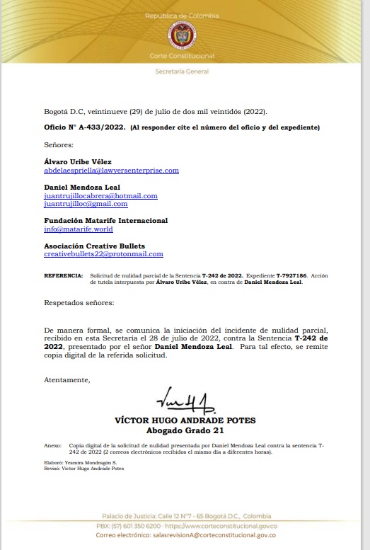 Acá el oficio de la Corte que informa sobre el inicio del incidente de nulidad parcial: