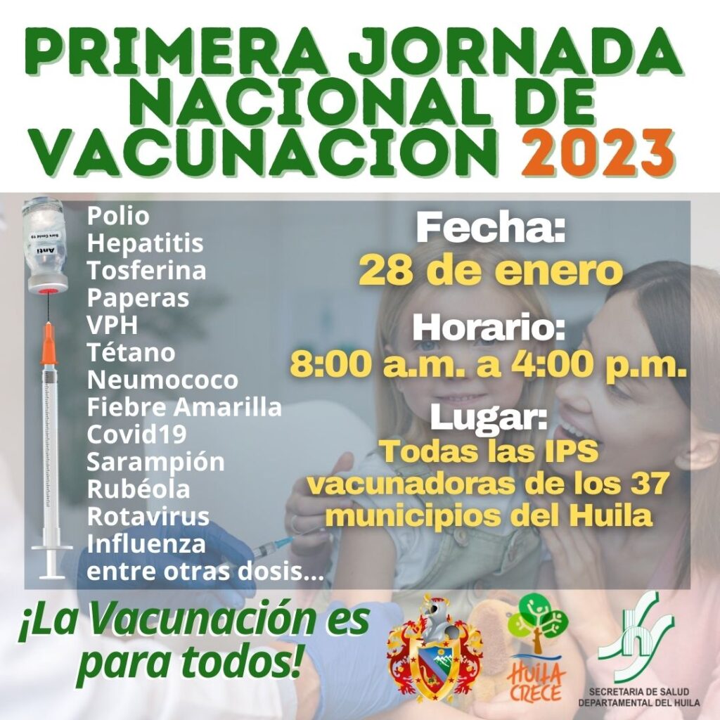 El Gobierno Departamental “Huila Crece” invita a ponerse al día con las vacunas este sábado 28 de enero en los 37 municipios.