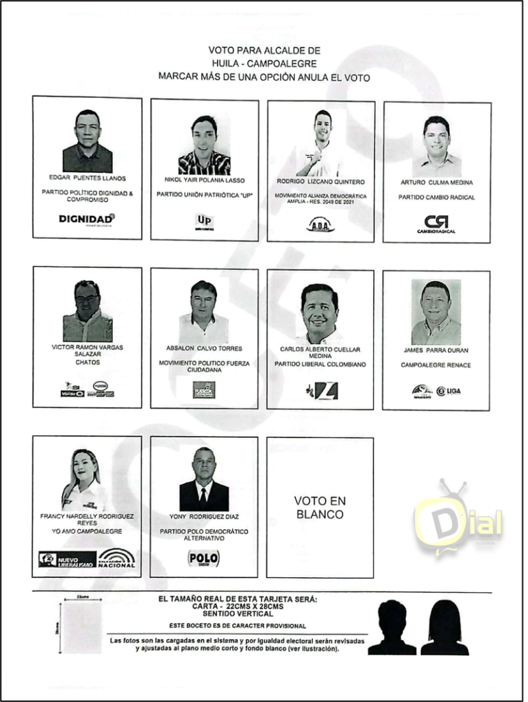 Sobre la mañana de este viernes 18 de agosto, por sorteo se definió la ubicación en el tarjetón de los candidatos a la alcaldía de Campoalegre en la registraduría nacional, el sorteo mediante balotas de ubicación en el tarjetón de cada uno de los 10 candidatos en disputa por la alcaldía de Campoalegre.Una vez realizado el sorteo mediante balotas, la ubicación de cada uno de los candidatos en el tarjetón quedo de la siguiente manera:1. Edgar Puentes Llanos – Partido Político Dignidad y Compromiso2. Nikol Yair Polania Lasso – Partido Unión Patriótica “UP”3. Rodrigo Lizcano Quintero – Movimiento Alianza Democrática Amplia “A.D.A”4. Arturo Culma Medina – Partido Cambio Radical.5. Víctor Ramón Vargas Salazar – Chatos (ASÍ, Partido Alianza Verde, Independientes, La Fuerza de la Paz).6. Absalon Calvo Torres – Movimiento Político Fuerza Ciudadana.7. Carlos Alberto Cuellar Medina – Partido Liberal Colombiano.8. James Parra Duran – Campoalegre Renace (Colombia Renaciente, Liga de gobernantes anticorrupción).9. Francy Nardelly Rodríguez Reyes – Yo Amo Campoalegre (Nuevo Liberalismo Salvación Nacional)10. Yony Rodríguez Diaz – Partido Polo Democrático Alternativo.Este es el boceto de manera inicial, el cual sería utilizado por los electores el próximo 29 de octubre para elegir alcalde en Campoalegre.